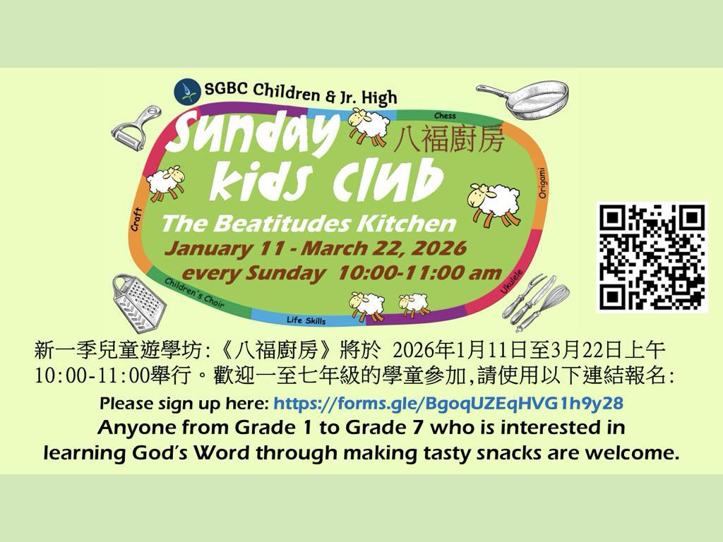 新一季兒童遊學坊:《八福廚房》將於 2026年1月11日至3月22日,上午10:00–11:00,在 222 室舉行。透過製作美味的小食,孩子們將學習耶穌如何教導我們過蒙福的生活: 善良、謙卑、憐憫和愛人如己。